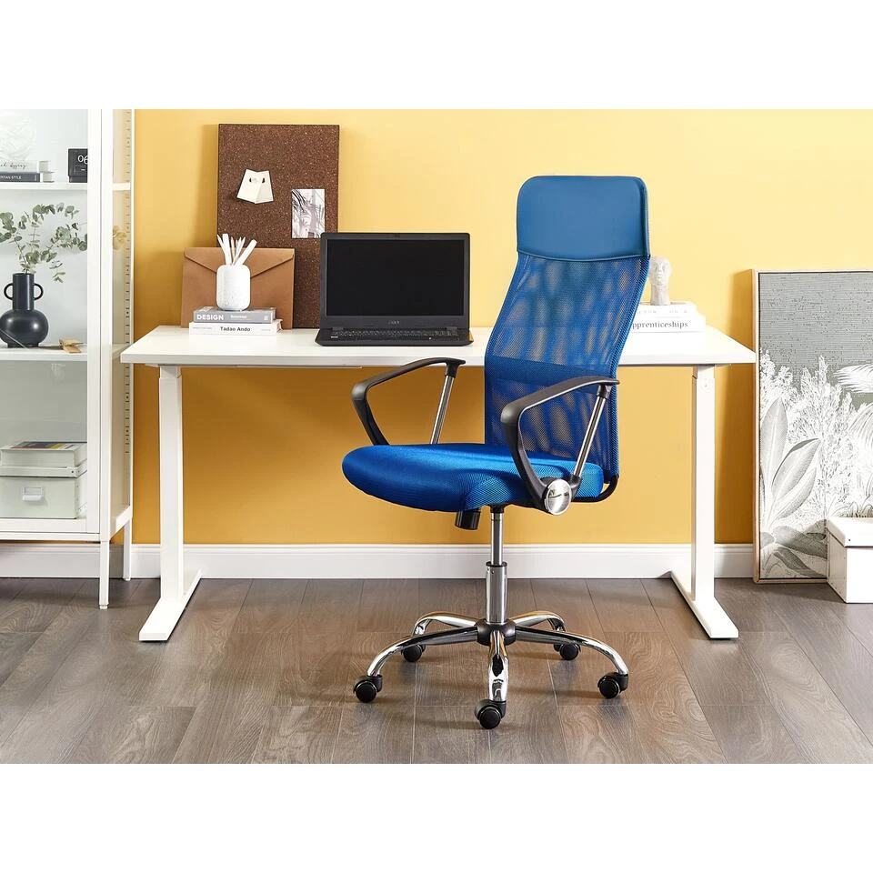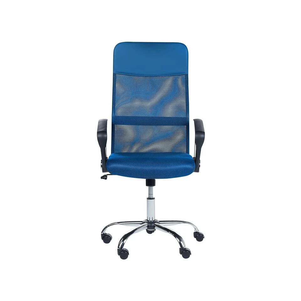Executive bureaustoel met hoge rugleuning. Deze kantoorstoel met een ergonomisch ontwerp biedt ondersteuning voor je lichaam tijdens lange werkdagen. Met de verstelbare zithoogte, 360° draaibaarheid en het kantelmechanisme kun je de stoel aan passen aan jouw comfort. De metalen, verchroomde basis is voorzien van 5 soepel rollende wieltjes. De dik gevoerde zitting is bedekt met een doorlatende mesh-stof, met hoogwaardig kunstleer op de hoofdsteun.