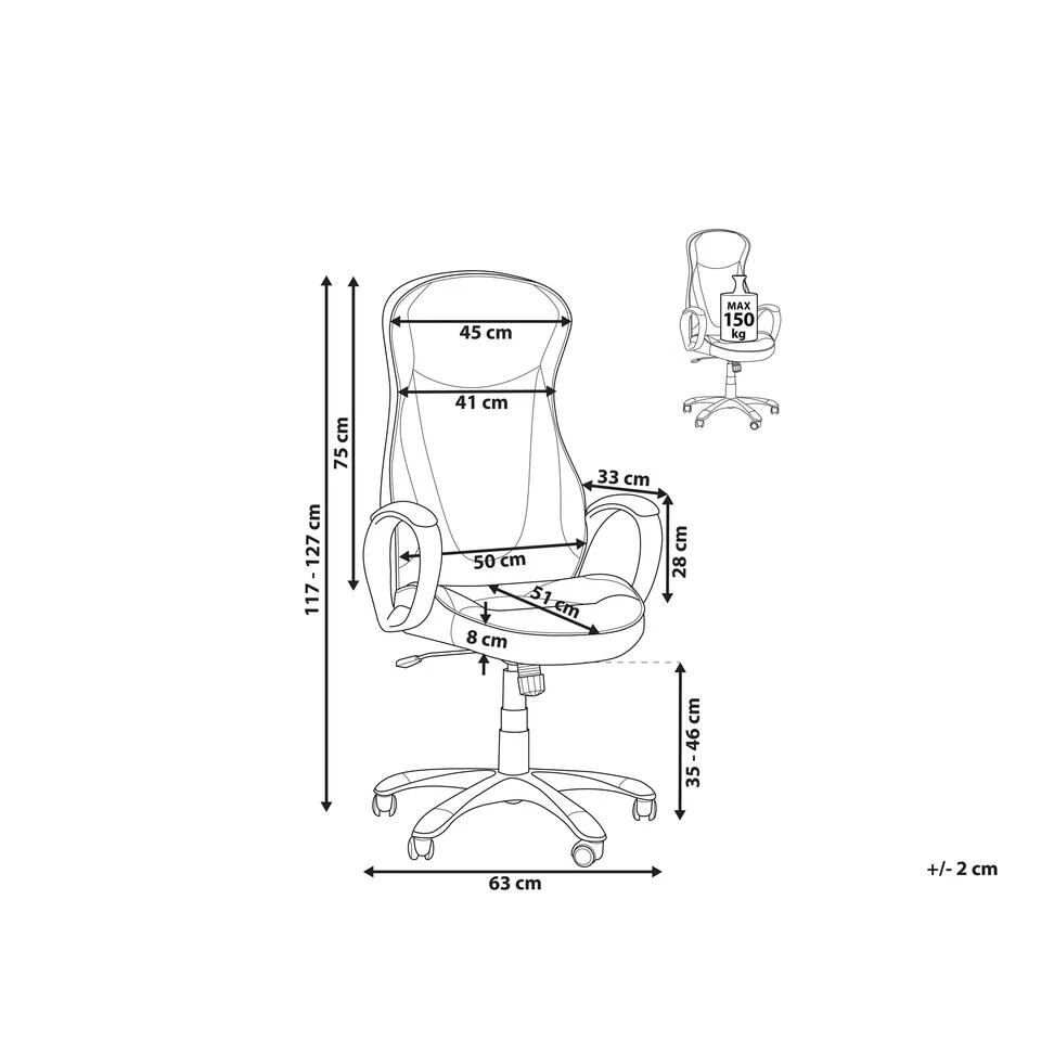 In hoogte verstelbare bureaustoel. Wanneer je vele uren achter een computer doorbrengt, is het belangrijk een goede houding en een stevige, maar comfortabele stoel te hebben. Met deze bureaustoel kan je een efficiënte dag hebben zonder last te krijgen van je rug. De stoel is met synthetisch leer gestoffeerd en gemakkelijk te onderhouden. Dankzij een elegant en modern ontwerp zal het zeker een opvallende factor worden in je thuiskantoor. Het beschikt ook over hoogteverstelling en kantelfunctie en twee van de wielen hebben een automatische veiligheidsremfunctie.