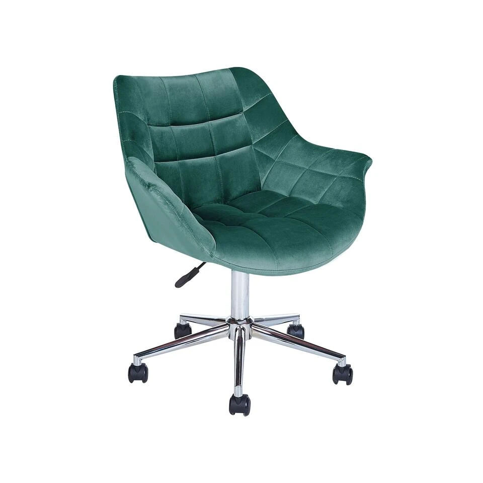 Draaibare bureaustoel. Maak je thuiswerkplek compleet met een stoel die niet alleen functioneel, maar ook uiterst stijlvol is. De brede, comfortabele zitting is bekleed met een fluwelen bekleding, die aangenaam aanvoelt en gemakkelijk schoon te maken is, en decoratieve stiksels geven het product elegantie. Een stabiel, duurzaam metalen onderstel op wielen heeft bovendien een hoogteverstelling.