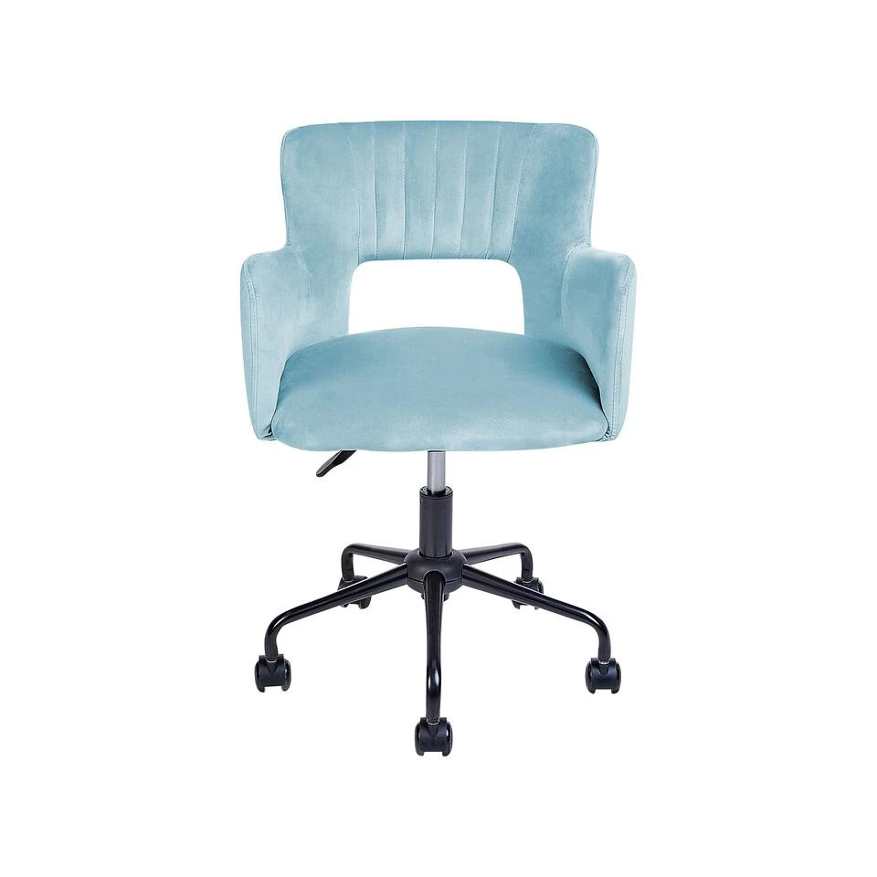 Stoel met fluwelen stoffering in mint. Deze bureaustoel heeft een prachtig modern ontwerp in combinatie met een retro sfeer en zorgt voor functionaliteit en comfort door de hoogwaardige materialen. De stoel heeft een dik gevulde zitting en armleuningen en rugleuning met opvallende details. De zachte fluwelen stoffering geeft diepte en kleur aan het geheel. De verticale tuft aan de binnenkant geeft de stoel ook nog een prachtig elegant gevoel.