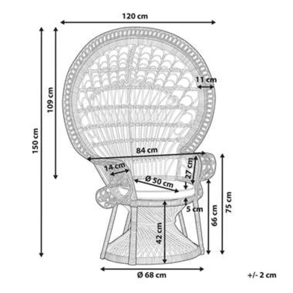 Volumineuze pauwenstoel van natuurlijk rotan. Het meest onderscheidende meubelstuk uit de jaren 60 en 70 is terug en is nog steeds stijlvol. De romantische en speelse waaiervormige rugleuning, doet denken aan een wijd open verenstaart van een pauw, is een ultieme blikvanger en geeft de fauteuil een majestueus en dromerig karakter. Dankzij de prachtig geweven rotan details wordt de stoel het middelpunt van elke boho ingerichte woonkamer.