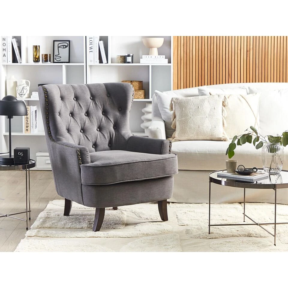 Fauteuil in donkergrijs. Een knetterend vuur brandt in de open haard, een spannend boek ligt klaar – nu ontbreekt alleen een nog comfortabele fauteuil! Met onze fauteuil komt deze droom uit. De prachtig gebogen armleuningen en de hoge, comfortabel gevormde rugleuning nodigen je uit om te ontspannen. De ruitvormige rugleuning is gewatteerd en heeft klassieke knoopornamenten.