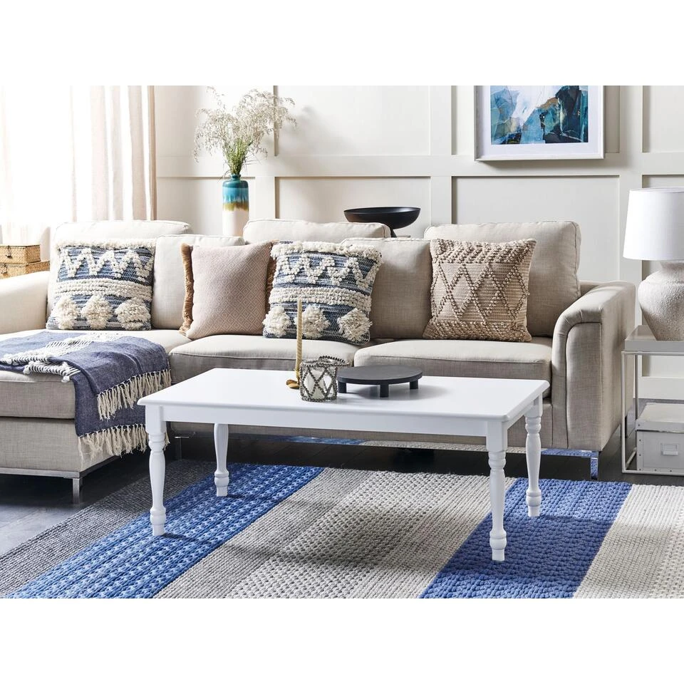 Robuuste vintage rechthoekige salontafel met gedraaide poten. Deze shabby chic salontafel is een ideale aanwinst voor interieurs met een vintage, Provençaalse of Franse country stijl. Dit meubel heeft een groot tafelblad, perfect om planten, kaarsen of andere decoraties op te plaatsen. De vier stabiele gedraaide poten geven een rustiek effect, terwijl de afwerking ervoor zorgt dat het goed past in verschillende kleurenschema’s.