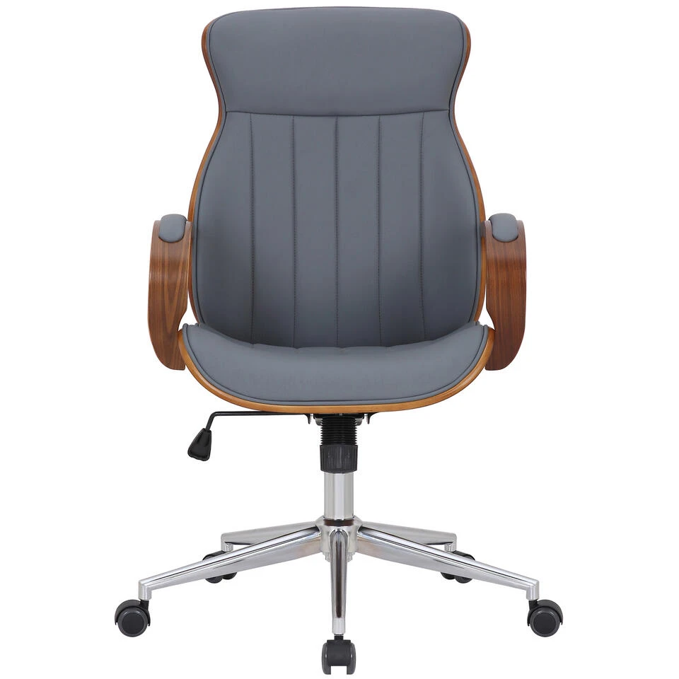 Deze bureaustoel heeft een zeer hoogwaardige kunstlederen bekleding. De kunstlederen hoes heeft het voordeel dat hij elastisch is en weer glad worden als ze ontlast worden. Dit ziet er niet alleen mooier uit, maar verlengt ook de levensduur van de stoelbekleding. Het houten frame maakt deze bureaustoel tot een absolute blikvanger en geeft hem een nobel design. Dankzij de traploze zithoogte is ergonomisch zitten gegarandeerd en zorgt het ingebouwde kantelmechanisme voor meer bewegingsvrijheid. Het frame is gemaakt van metaal in chroomlook en is zeer stabiel. De bureaustoel staat stevig op vijf zwenkwielen.