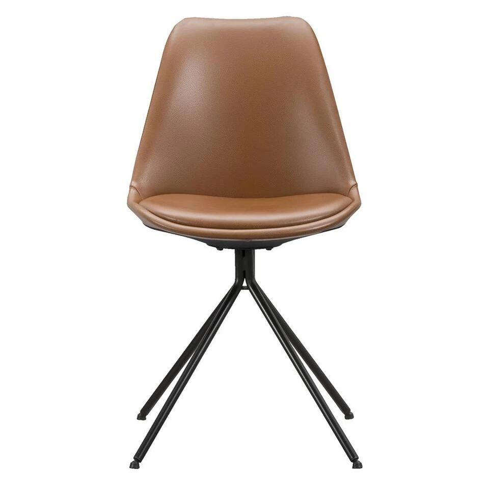 Eetkamerstoel Senja heeft een lederlook uitgevoerd in een cognac kleur. Deze stoel heeft een onderstel van zwart metaal. Eetkamerstoel Senja heeft een moderne look. Deze trendy kuipstoel wordt gekenmerkt door eenvoudige maar praktische vormgeving. Deze kuipstoel heeft alles wat je van een modern stoeltje mag verwachten. Stevige metalen poten met een industriële look en een kuipje met een fijn zitcomfort.