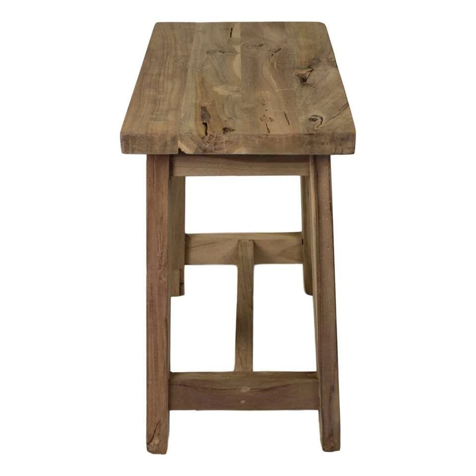 Gerecycled teakhout De kruk is volledig geproduceerd van gerecycled teakhout. Gerecycled teakhout wordt gemaakt van oude planken uit huizen, scholen, fabrieken. Dit type hout heeft dus al een leven gehad. Het is extreem sterk, daarom kan je er gemakkelijk nieuwe meubels van maken. Teakhout heeft een prachtig karakteristieke uitstraling.