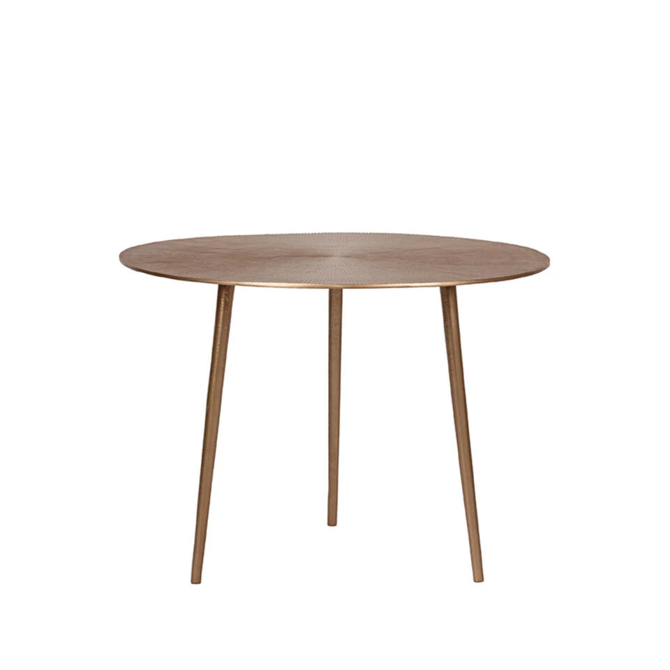 Salontafel Nobby XL, uitgevoerd in antiek goud is een speelse tafel met de afmeting 60x60x45 cm. De tafel is gemaakt van gegoten metaal en heeft een rond blad. De top is voorzien van een prachtige gravure; lijnen vanuit het centrum lopend naar de buitenkant. De speelse uitlopende poten zorgen voor stevigheid en een trendy uiterlijk.