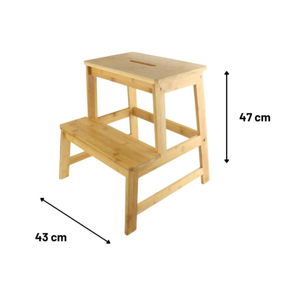 Houten keukenkurkje van Orange85. Het krukje heeft een treden en is gemaakt van bamboe. Ideaal voor hoge kastjes in de keuken. De afmetingen van het krukje zijn 43x43x47cm.