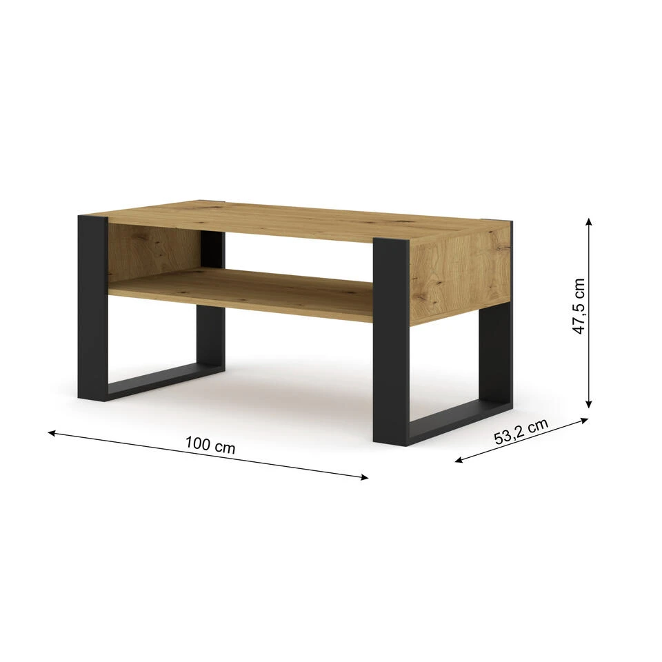 Zeer moderne en praktische salontafel voor in de woonkamer. Hij kenmerkt zich door een moderne en oogstrelende uitstraling – zijn charme wordt bepaald door grote zwarte poten in framevorm, die mooi contrasteren met de rest van het meubilair. De tafel heeft een extra plank.