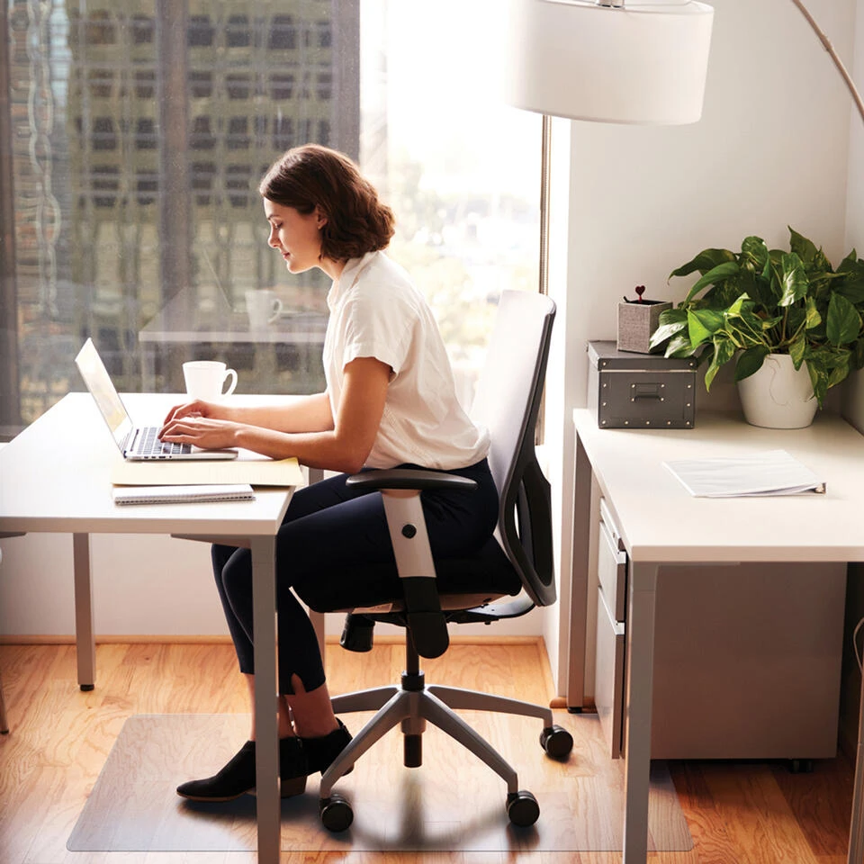 Een bureaustoelmat is uitermate geschikt voor het beschermen van een harde vloer op jouw werkplek, zoals een gietvloer, beton, vinyl, pvc, tegels, parket en laminaat. Je voorkomt er beschadigingen mee, die in de loop der tijd ontstaan door de wieltjes van jouw bureaustoel en jouw schoenen. Niet alleen op kantoor, maar ook bij een thuiswerkplek, houdt een vloerbeschermer jouw vloer langer mooi. Door een speciale coating aan de onderzijde, verschuift de mat niet wanneer je er overheen rijdt met jouw bureaustoel.